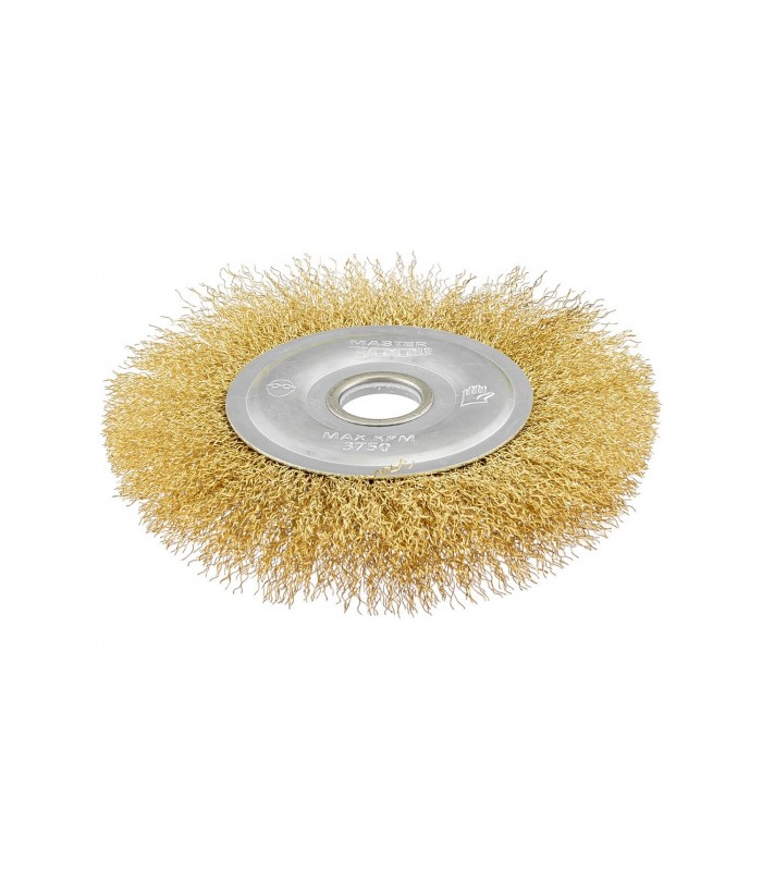 Kotúčová drôtená kefa bočné s ryhovaným mosadzným drôtom Ø 150*22,2 mm je vyrobená z pružinovej ocele C72 a je pokrytá mosadzovým povlakom.