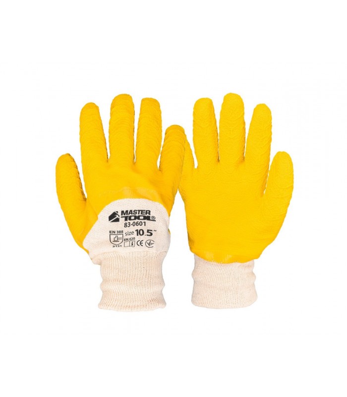 Rukavice pracovné MASTERTOOL z bavlny s prírodným latexovým povrchom, žltý, pletená manžeta 10, 5" 83-0601
