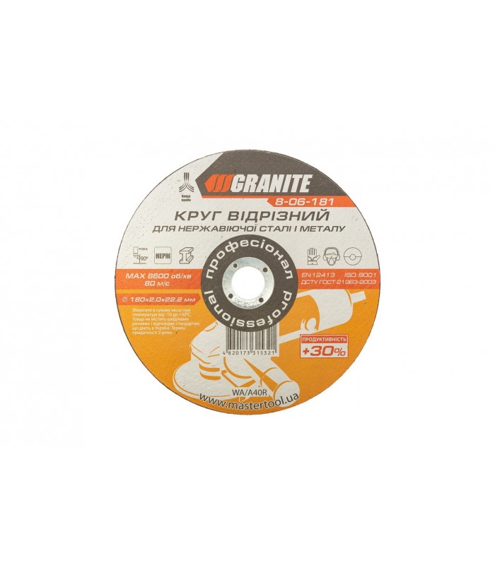 Kotúč rezný na kov a nerez 180*2,0*22,2 mm PROFI +30 GRANITE je vyrobený z abrazívneho materiálu elektrokorundu (oxid hliníka) s bakelitovou väzbou a plochým profilom typu 41.