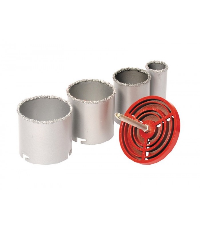 Sada obsahuje wolframové nástreky s priemerom 33/53/67/73 mm a centračné vŕtadlo s otáčkami do 1500 ot/min.